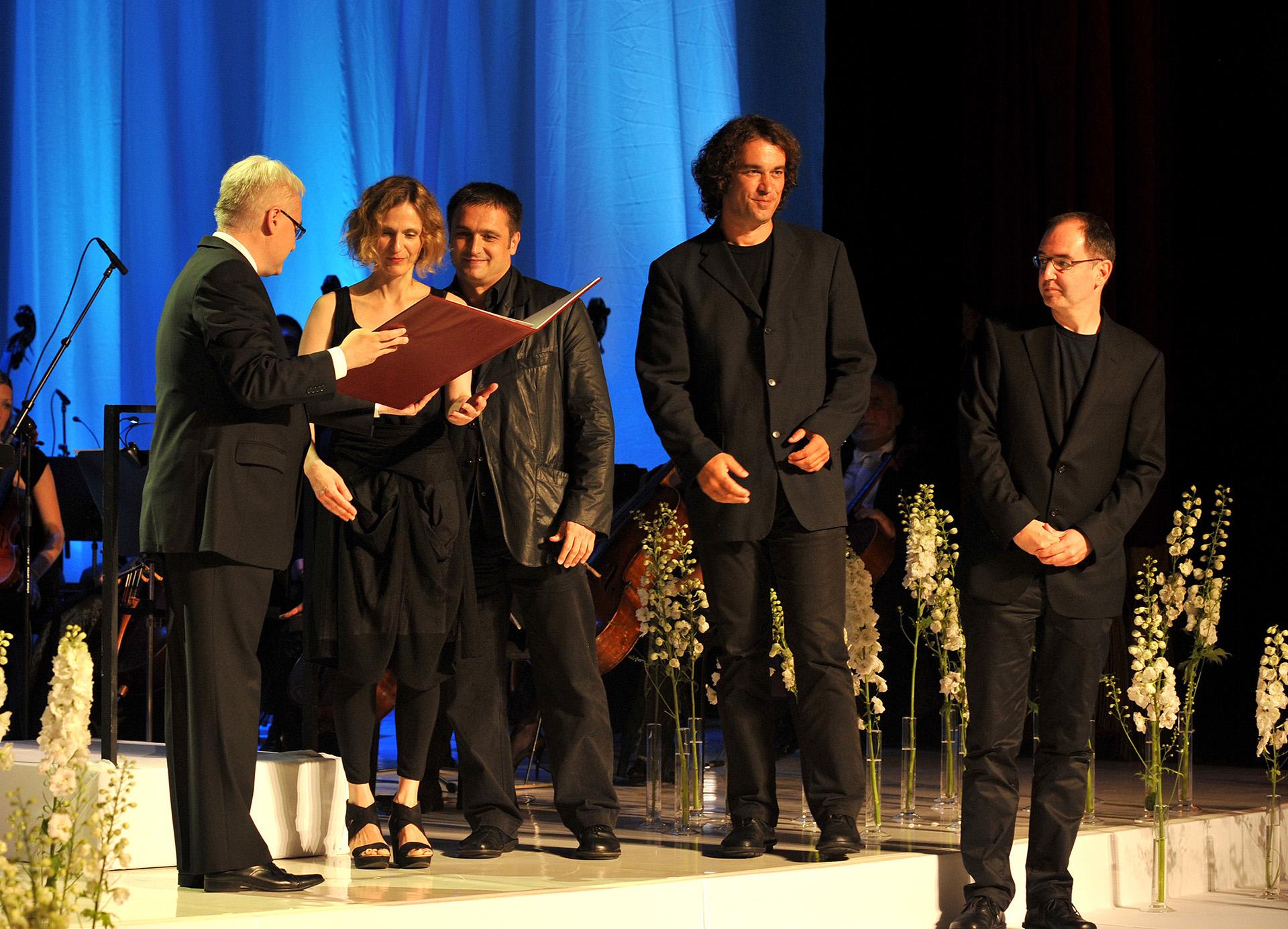 At the gala ceremony in the National Theatre in Zagreb on June 25th 2012, on the occasion of Statehood Day of the Republic of Croatia, Croatian President dr.sc. Ivo Josipović presented decorations and awards to meritorious organizations and individuals for special merits and contribution to the scientific, cultural, economic and other development of Republic of Croatia. 3LHD was awarded the ?Charter of the Republic of Croatia? for exceptional and successful promotion of contemporary architecture in Croatia and abroad. In behalf of 3LHD architects the award received Sasa Begovic, Tatjana Grozdanić Begovic, Marko Dabrović and Silvije Novak.
