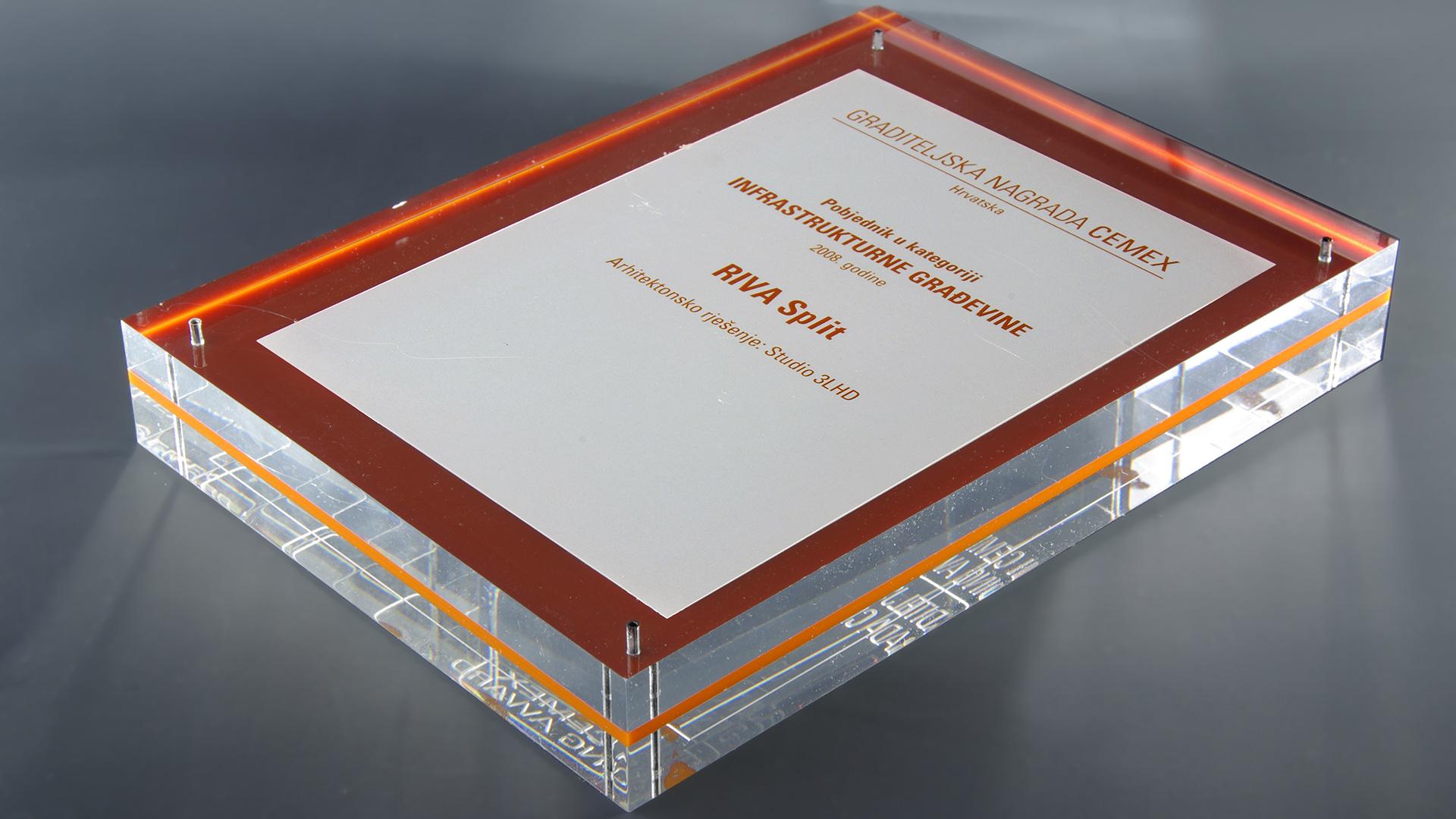 On Friday, June 6 2008 in Hotel Le Meridien Lav, Split project Riva Split Waterfront was elected as a Croatian competitor for the XVII CEMEX BUILDING AWARD in Mexico. The award is one of the most prestigious world recognitions in the field of building. It is given in three categories: Housing, Institutional and Industrial Building, Infrastructure projects with special awards Sustainable Building and Accessibility.