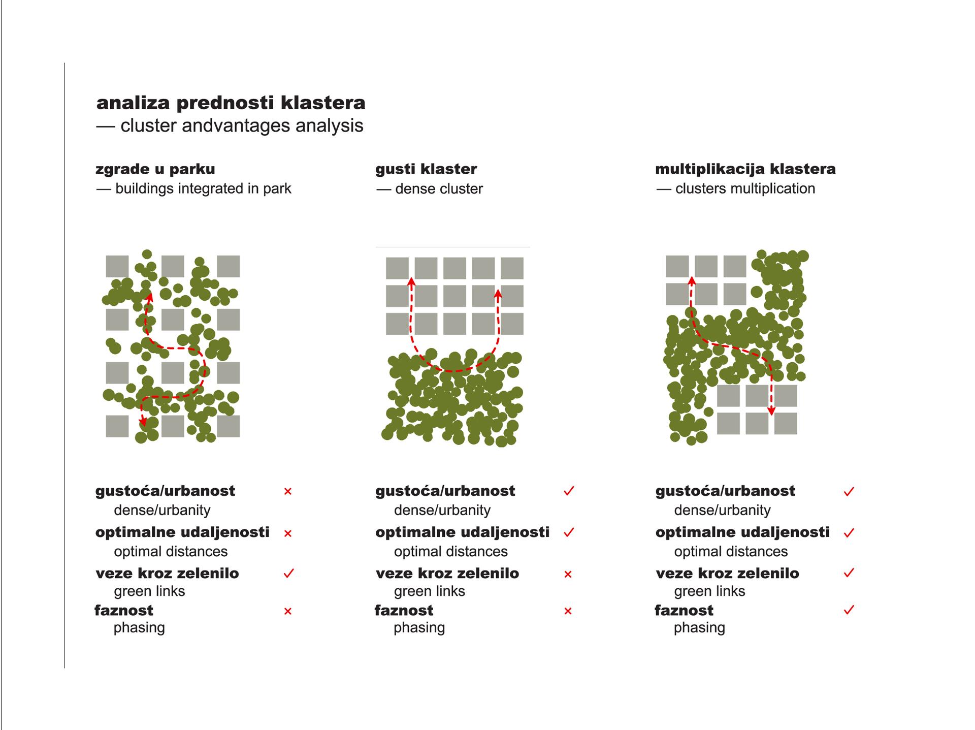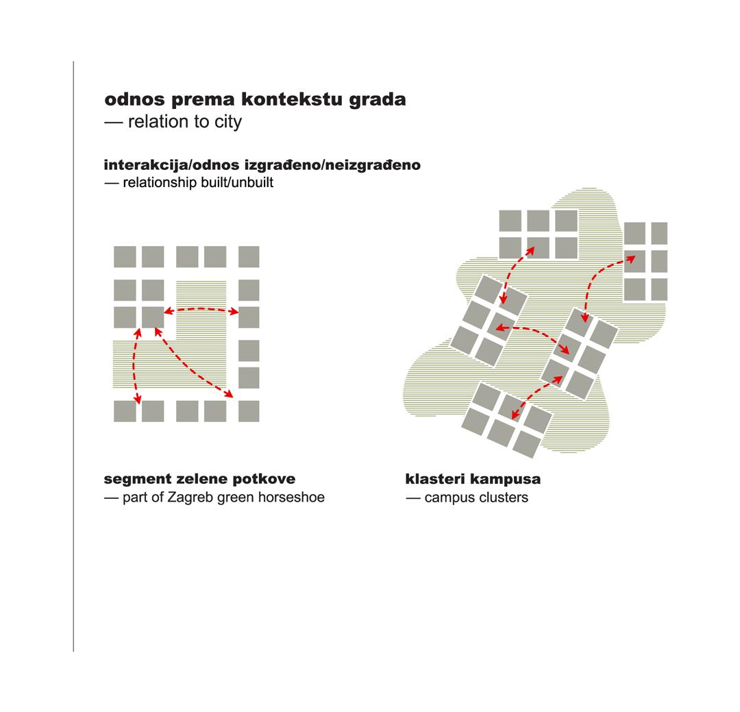 By planning the new Borongaj Campus we are also creating a development plan for a new part of the city, and we need to resolve two important issues: how to create a new quality part of the city and what will be a major catalyst for its development. 3LHD has proposed the creation of the concept of clusters in a green forest, clearly defining the "empty" natural areas, borders, infrastructure and hierarchy. Each cluster has a matrix and its specificity - the public space, public buildings and a formed façade. In this way we gradually develop a plan for the Green Campus Borongaj.