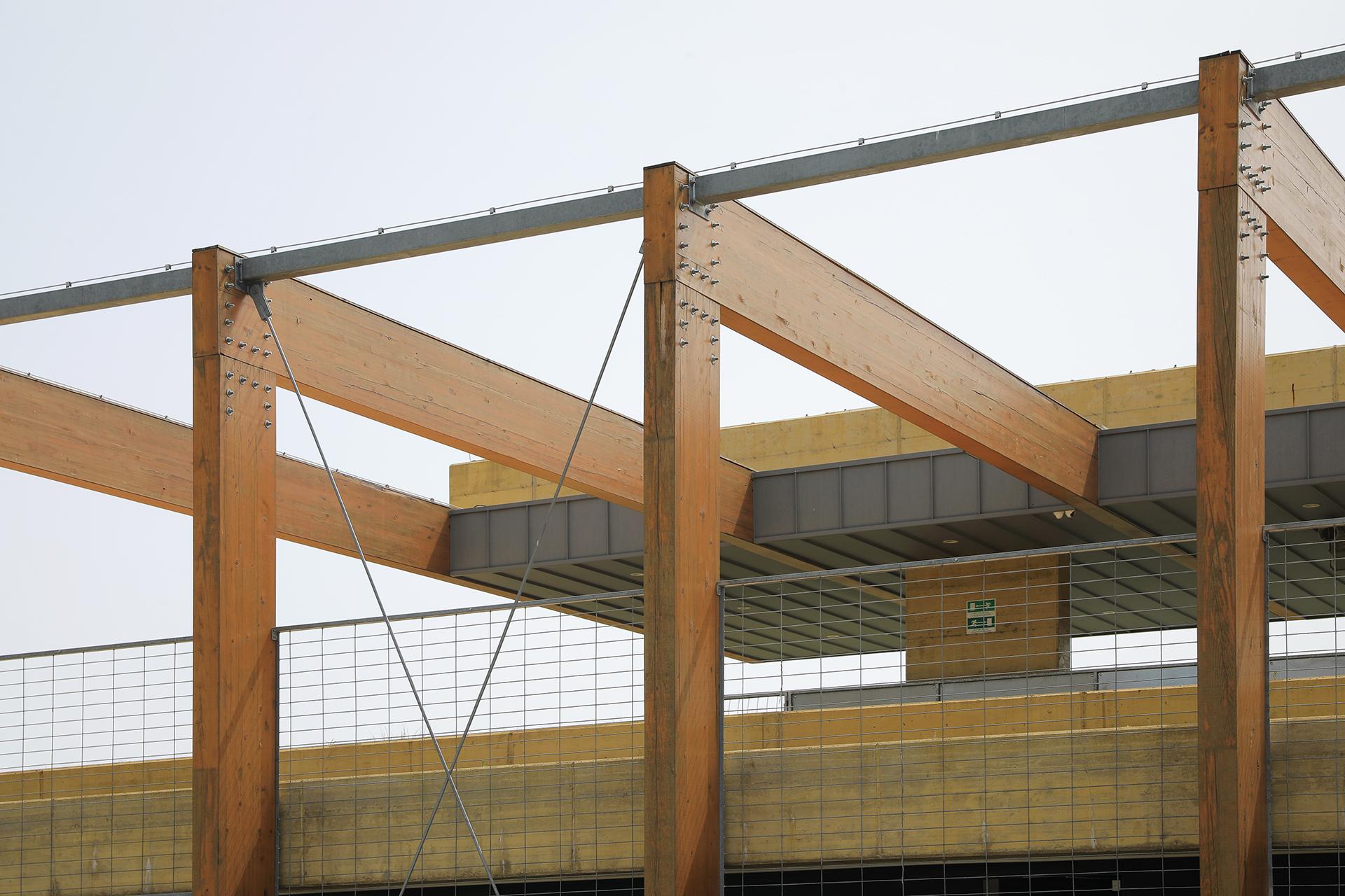 Pedestrian communication rises up to the roof of the building, and on the other side of the building, it descends and connects with the terrain. In this way, the roof becomes a passage terrace, partially covered with a canopy extending over and above the spectator stands.