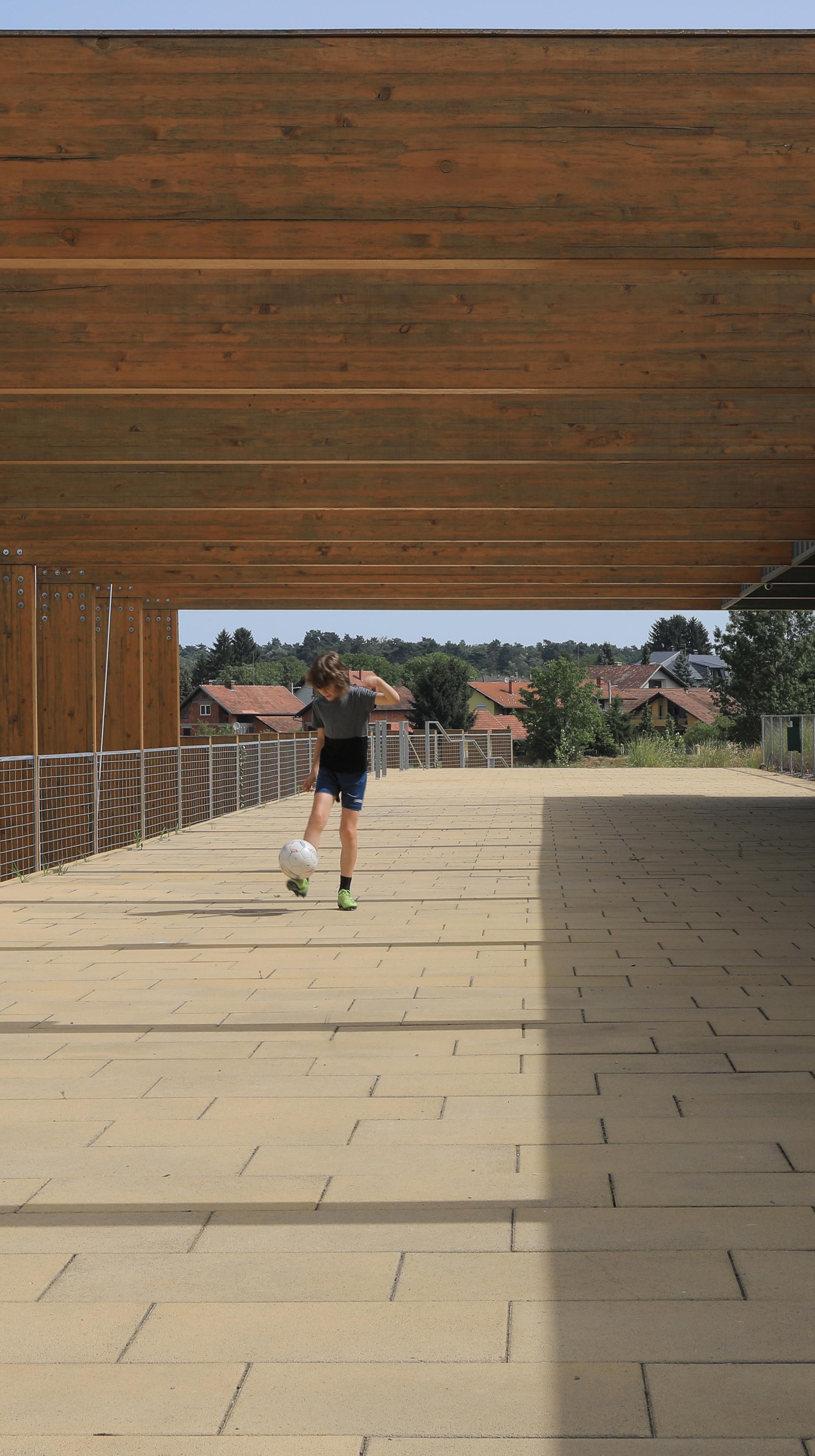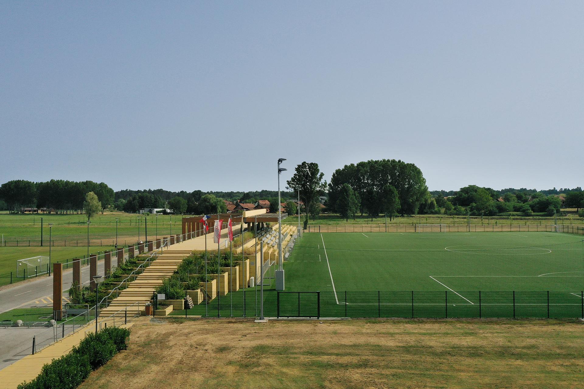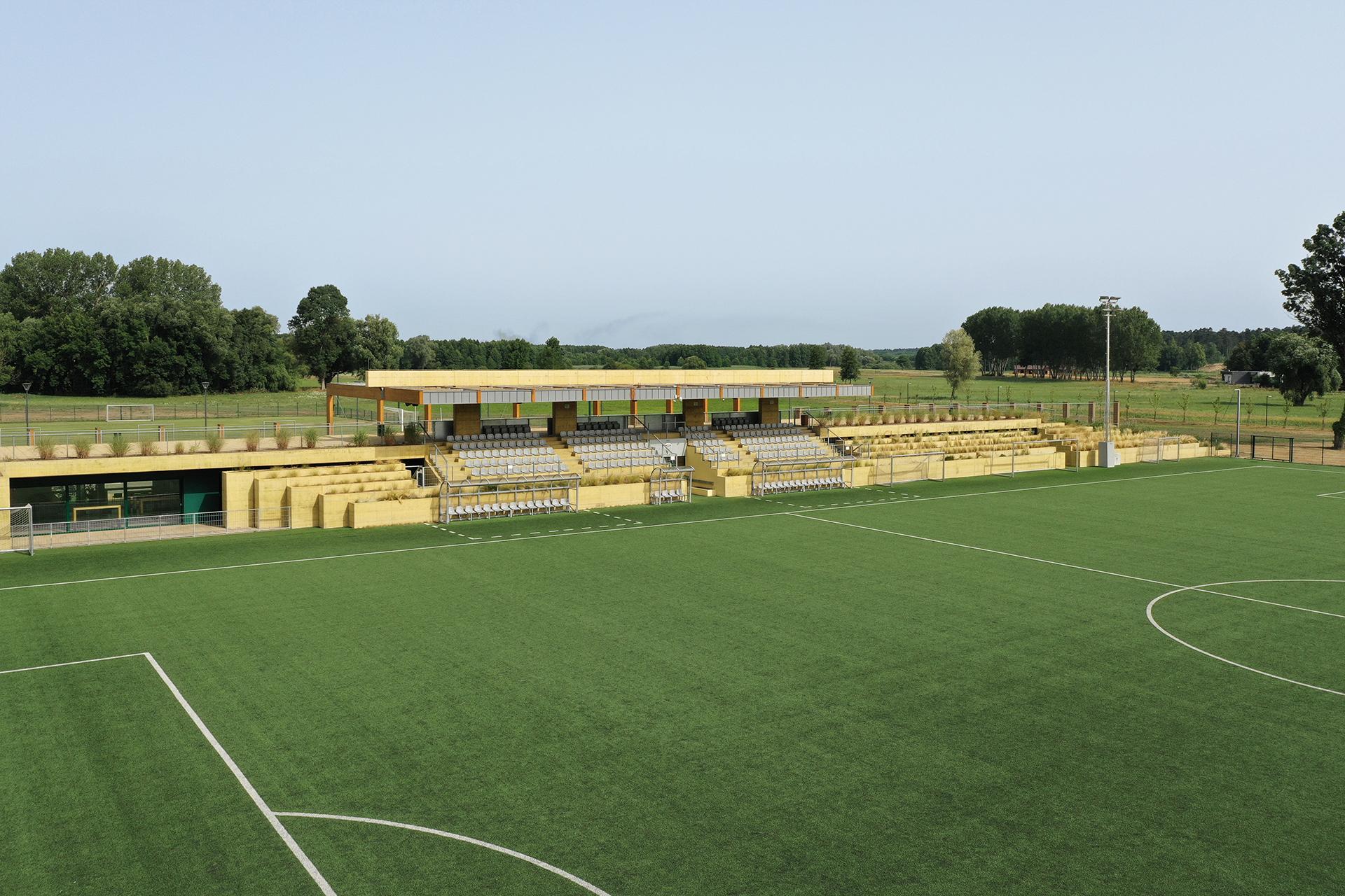 The football stadium building is the central element of the sports and recreation center. The target categorization of the building and the open playgrounds is the UEFA 1st category stadium. The one-storey building has a public rooftop which is also an access path to the 200 seat capacity stands.