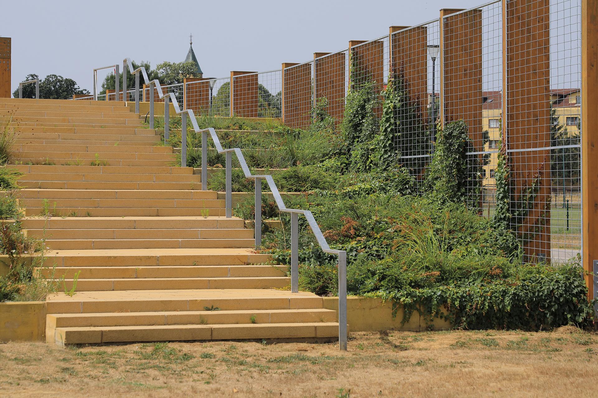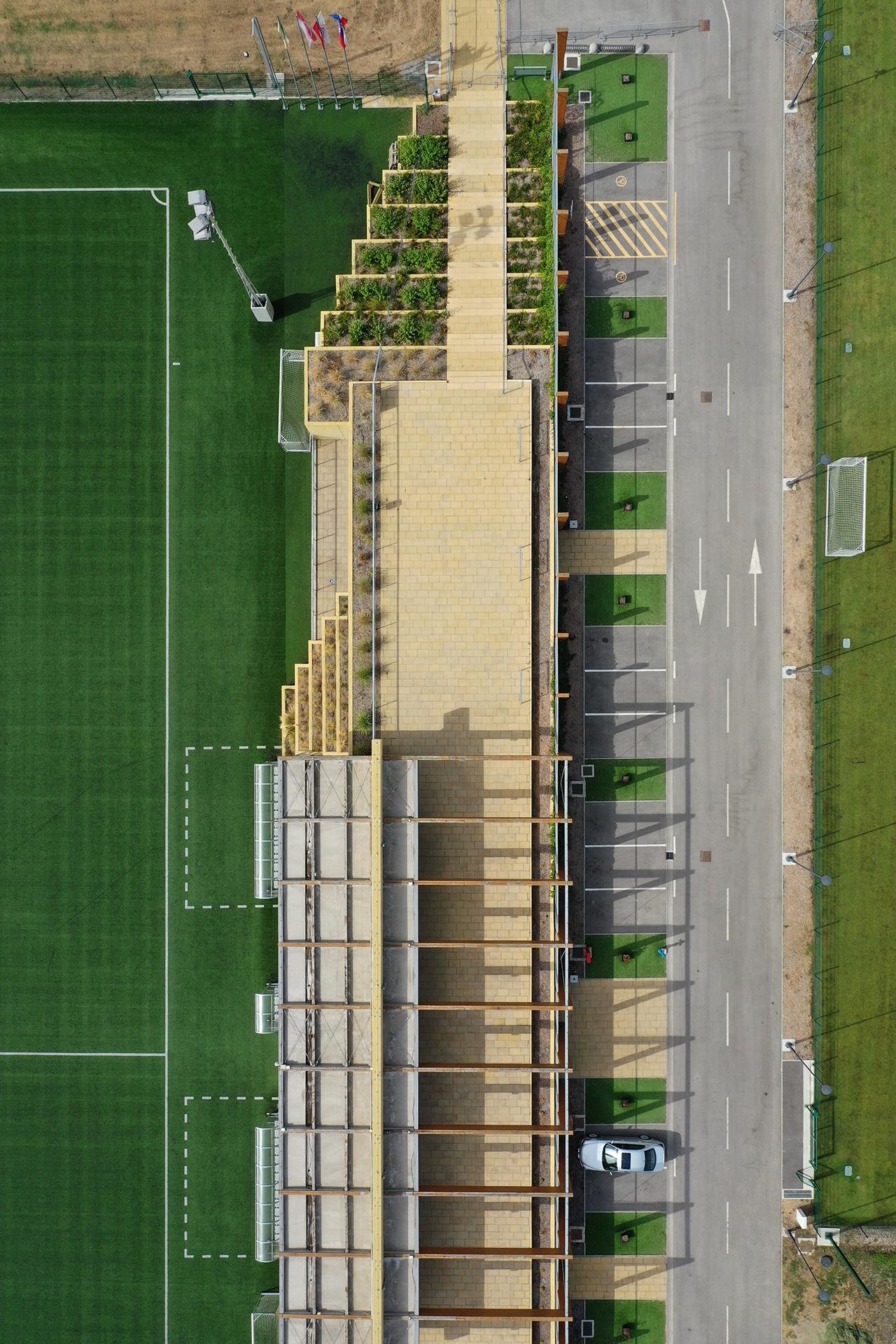 The aim of the project design was to interpret the functional elements of the stadium in a modern way with the best possible fit of the building in the surrounding environment. The wooden canopy construction together with the greenery on the stairs and the hanging garden at the back of the building introduces an element of nature that provides a new visual and tactile experience.