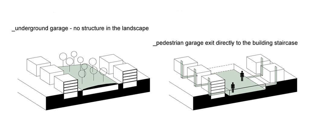 Using pedestrian domination and exclusively pedestrian streets we want to create a place of social encounters so typical for the Mediterranean. Small urban squares are also formed on the crossroads of the pedestrian streets, and the loose structure opens views towards the sea and penetrates into the internal blocks developing Green Courtyards. These green oases are small theme “parks” and a contemporary interpretation of sinkholes and dry stone walls. They take on a variety of contents in the function of surrounding construction - from high greenery, playgrounds, gardens and the possibility of creating small local pools.