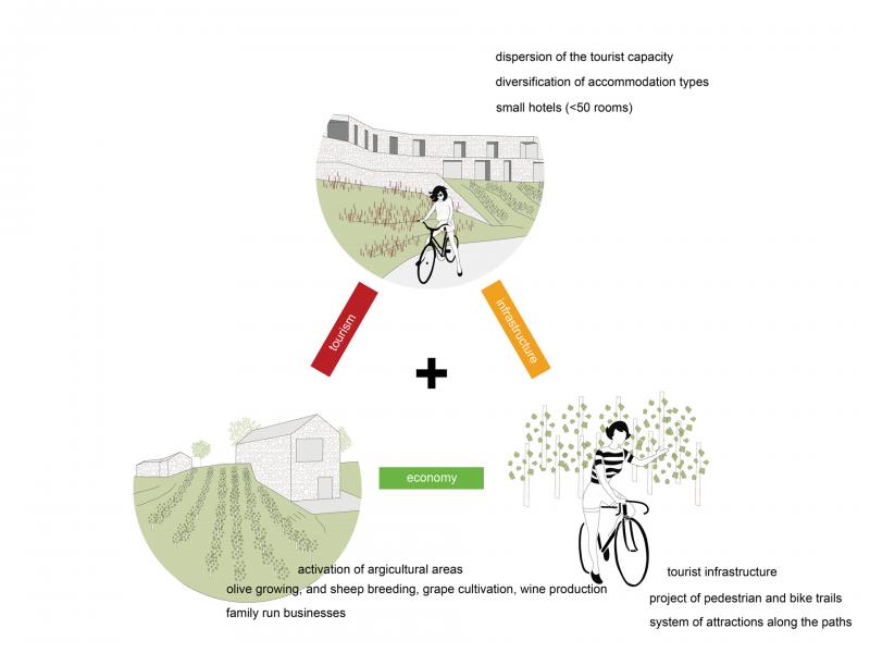 The result of the study is a set of project proposals that are the product of a comprehensive debate on the development of the area. With a uniform and thoughtful development of infrastructure and economy while protecting natural specifics, the planned development strives to sustainability. The concept promotes economic growth, preservation of natural resources, increase of the quality of life of the local population and the expansion of the tourist offer through the implementation of locally oriented projects, based on three basic points: construction of tourist infrastructure in the landscape, dispersion of accommodation, economic development through local educational centers.
