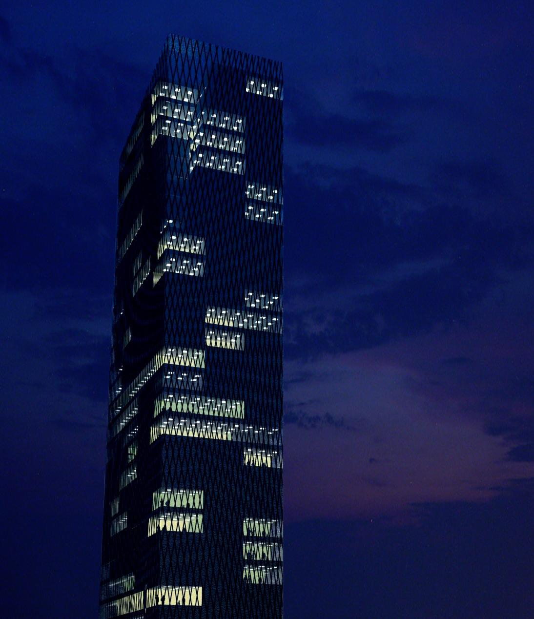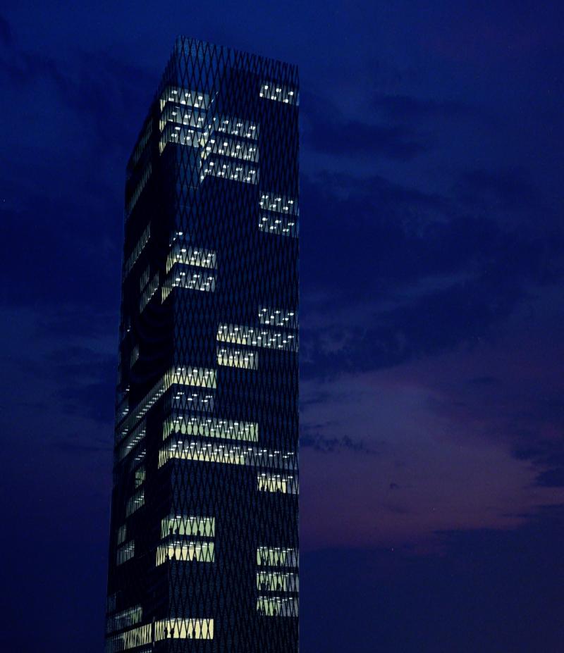 The vertical axis of the office tower is shaped to transform the crystalline form and create interesting and varied spaces in the building itself, while the irregular pattern of front windows reflects the lights of cars passing the bridge and creates shifting images in the River Sava.