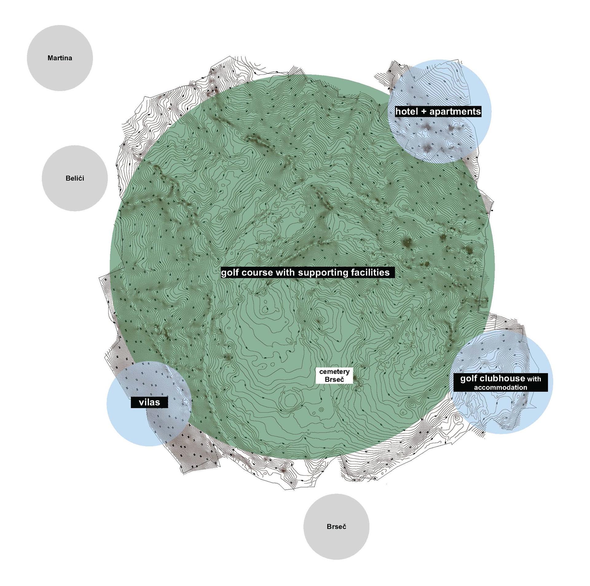 The design concept of the area is based on the idea that all new contents should be an extension of the current, exceptionally valuable context: the natural amphitheater, the village on the edge of the zone and the existing trails and paths. Consequently, only the golf course is located centrally, while the accommodation units intended for golfers, these modern nomads who will be returning to Brseč over and over again, are placed on the edges of the area, the slopes and the cliff above the sea, and modeled on the design of the existing buildings: villas on the west, golf clubhouse on the southeast and a tourist apartment village with a hotel on the northeast.