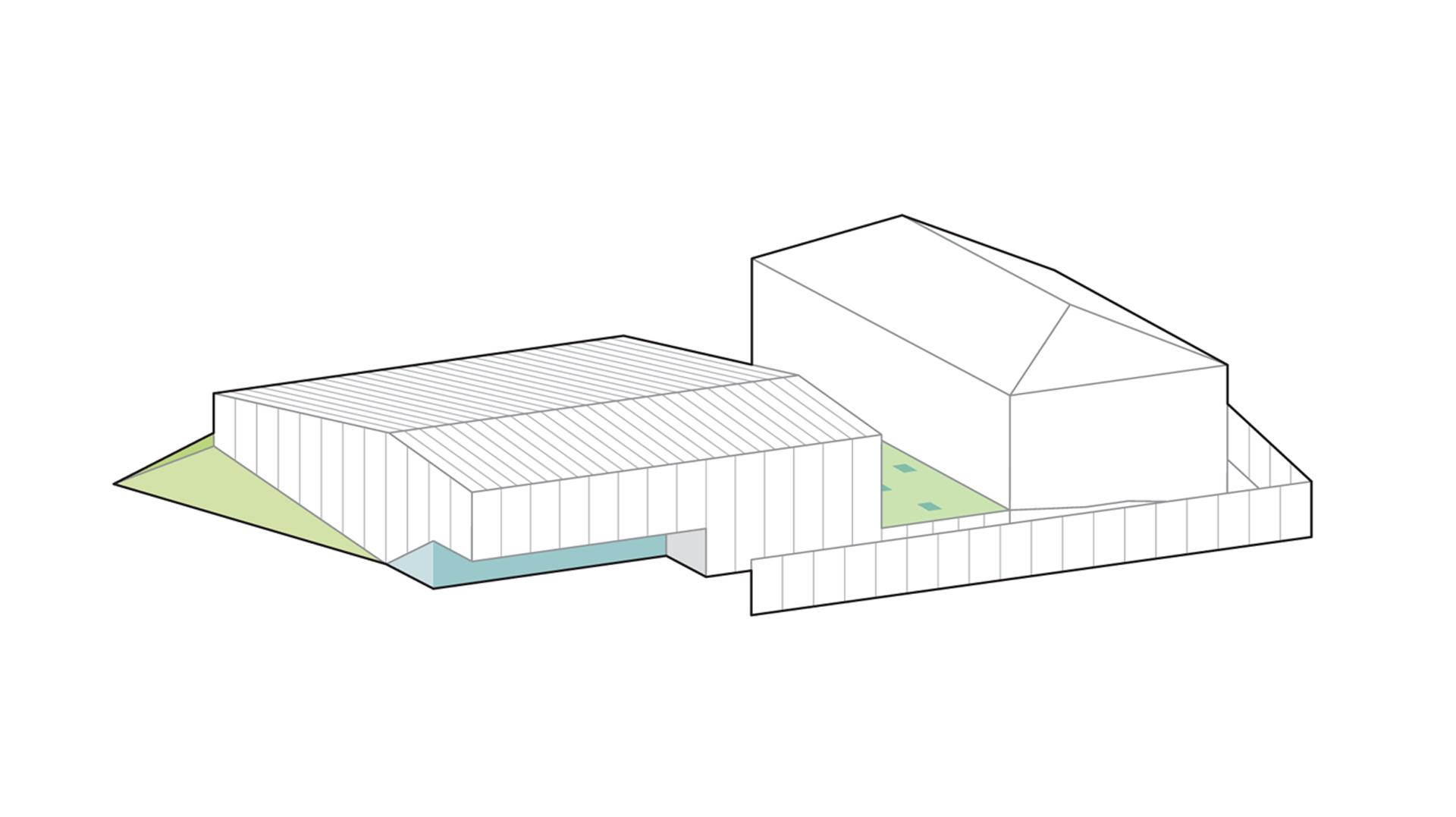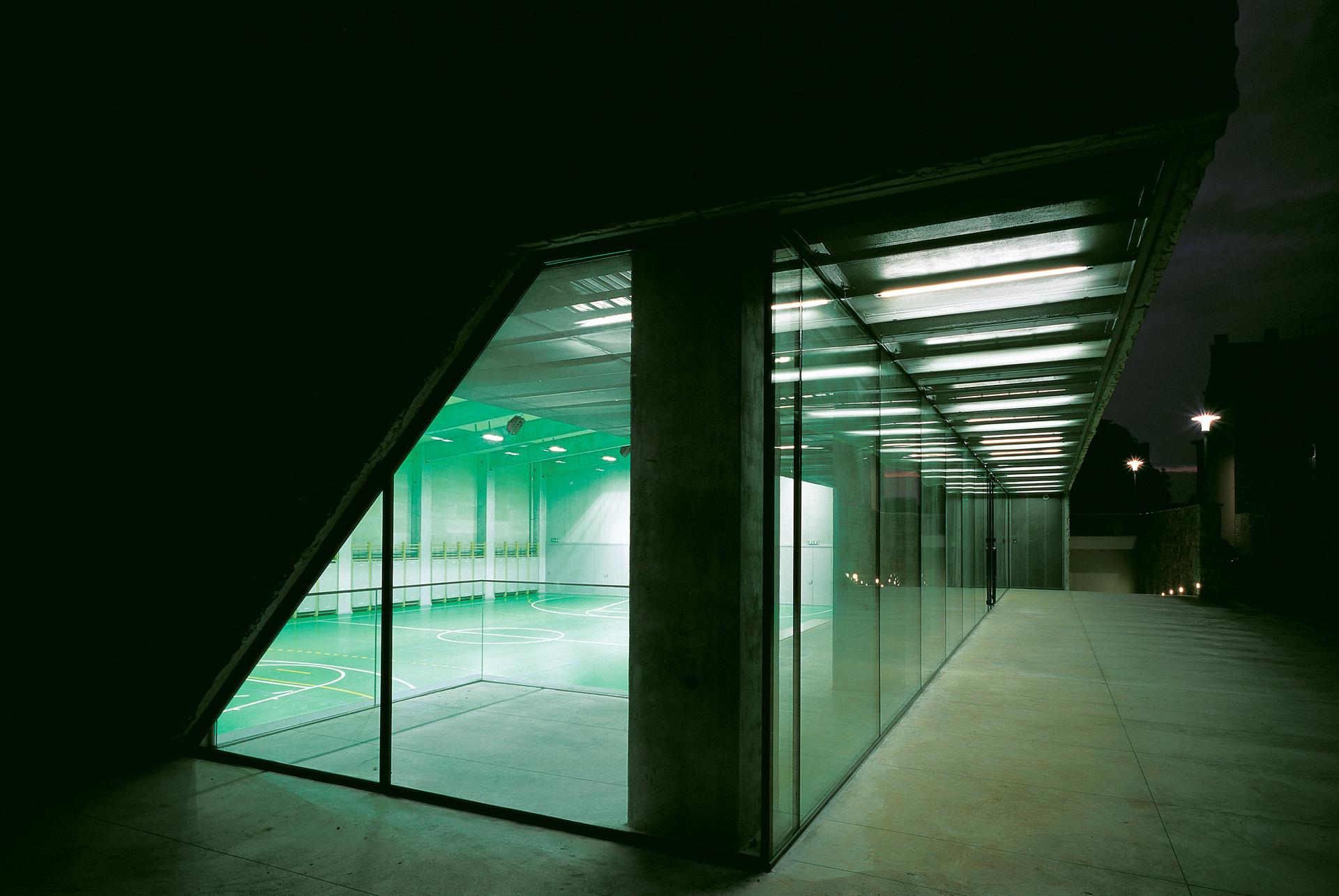 Actually, the size of the building has been defined by the basketball playground and modified by additional facilities on the gallery: a fitness centre and a sauna, while the low and small locker rooms were planned as a connection element to the school. This connection to the old school with the utility rooms is hidden underground.