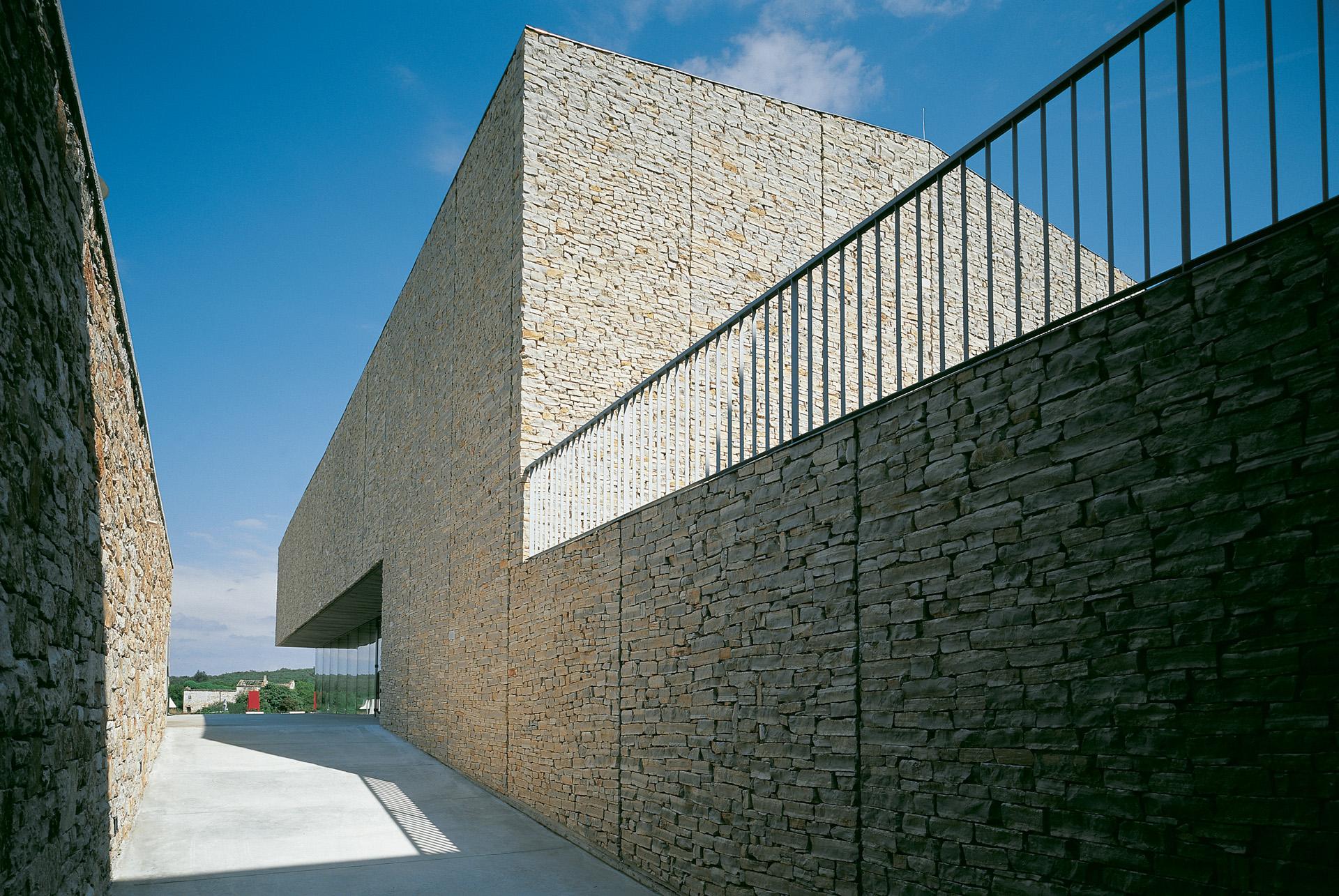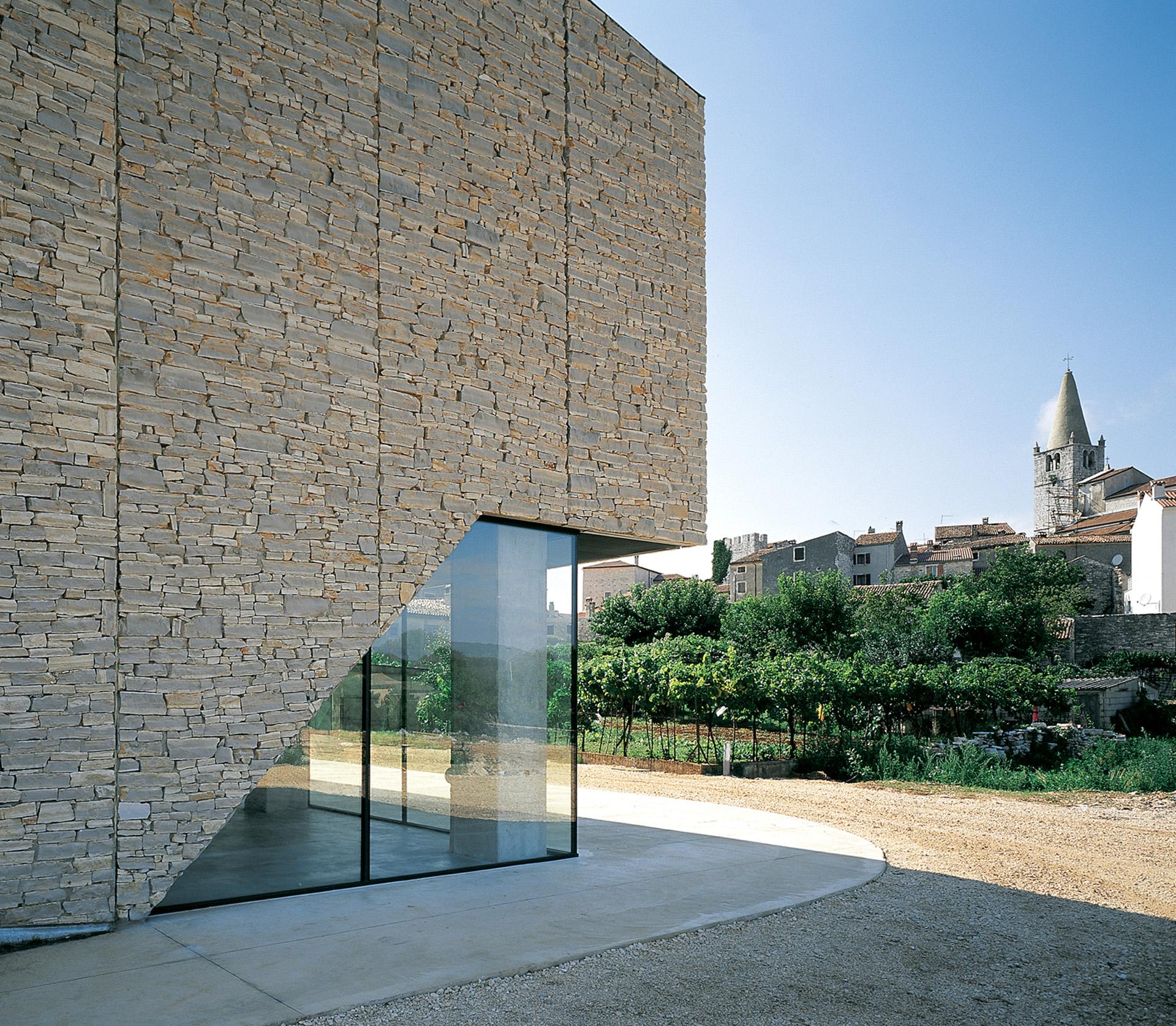 Inspiration for the structure has been found in the small traditional stone hut — kažun, a small multifunctional building used as a shelter for shepherds that provide a cool environment in hot weather and insulating against the cold in the winter. Traditionally built without any cement or mortar with carefully selected interlocking stones found on the site this structure is a primitive example of prefabrication present in the Mediterranean since prehistoric times. The traditional local dry stone wall motif has been used as a template/pattern for the whole surfacing of the sports hall.